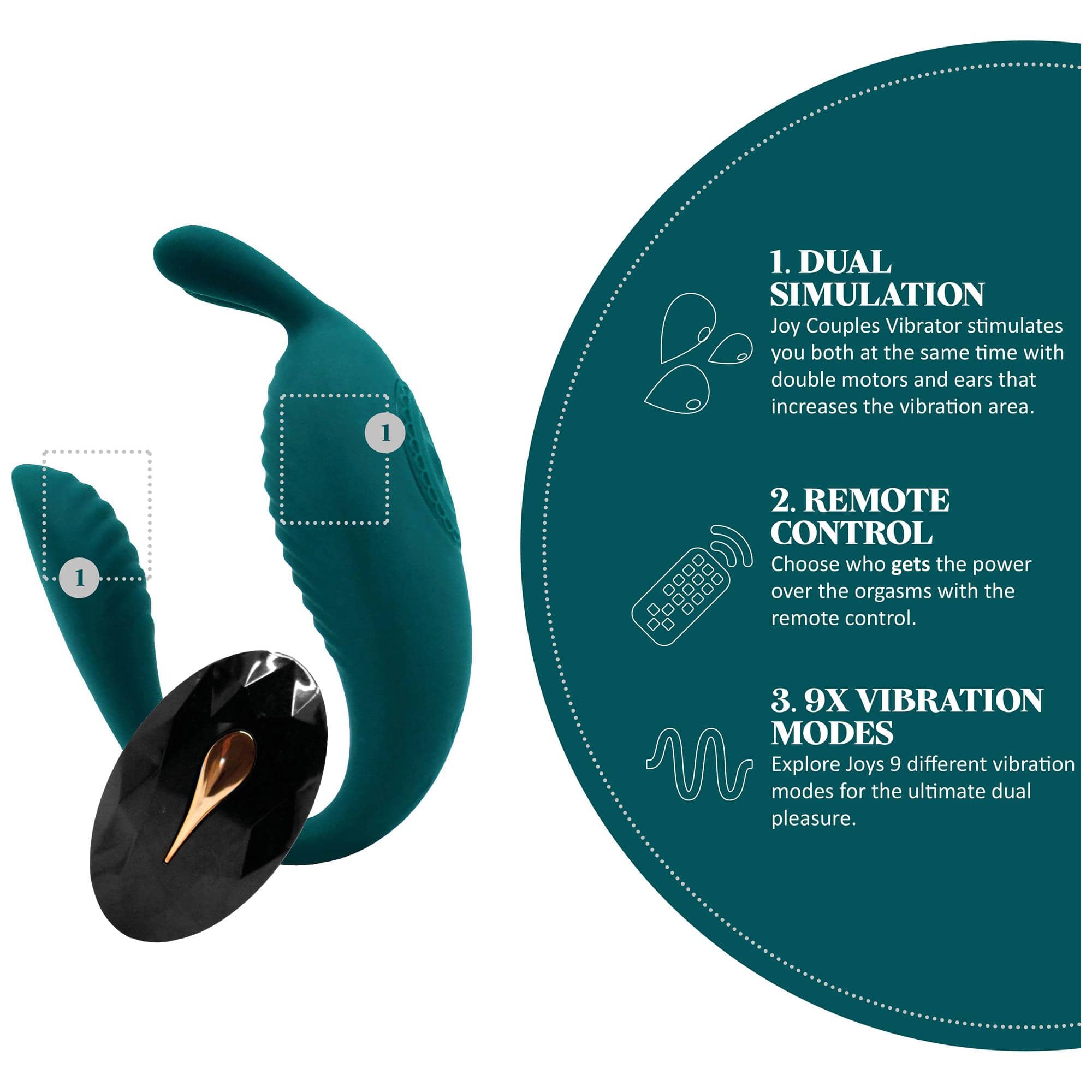 Hvad gør Envy Vibes – Joy Couples Vibrator speciel? Envy Vibes – Joy Couples Vibrator er en parvibrator med en stimulerende struktur og klitorisvibrator med form som rabbit vibrator. Den har 9 forskellige vibrationstilstande, som du nemt kan styre med fj