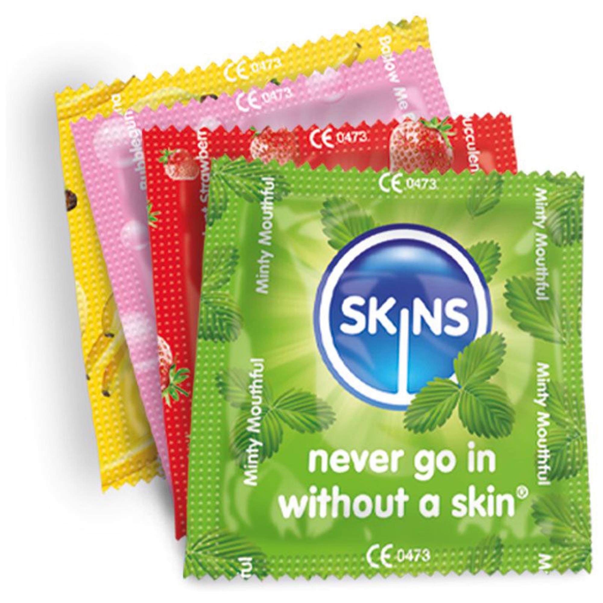 Hvad gør Skins Condoms Flavours 12-pack speciel? Denne pakke med premiumkondomer har en kombination af smage, så du kan finde din favorit og sætte et mere delikat præg på dit sexliv. Kondomerne har smag af banan, tyggegummi, mynte og jordbær – det gør, at